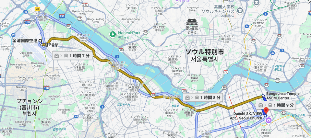 金浦国際空港からなら約1時間で到着できる。地下鉄2号線と9号線が交差する江南駅を中心に、どこへ行くにも便利な立地だ。